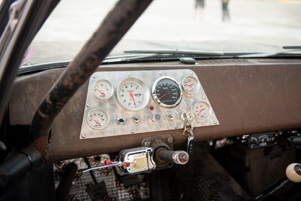 Fittingly, power comes from a junkyard 6.0-litre LS, its fuel injection swapped for an era-appropriate Holley 750 “double pumper.” Big-block Chevy headers were adapted to fit the LS, feeding an exhaust that exits just below the passenger door. Street-legal slicks hug vintage, Americana-style five-lug steel wheels—an ideal blend of modern muscle and old-school racecar grit.